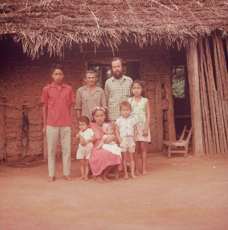 - Familia guarasug'we afuera de su vivienda junto a Jürgen Riester.