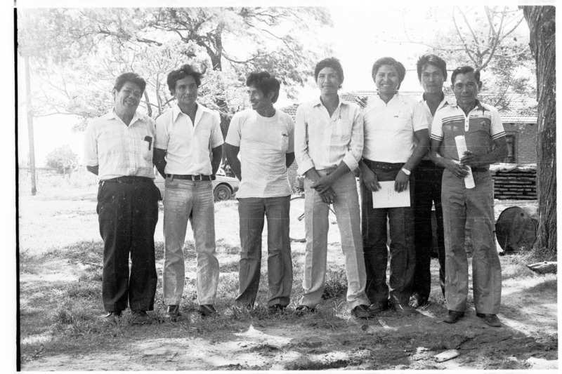 - Delegados indígenas participantes del Cuarto Encuentro del CIDOB en el patio de la Casa del Campesino. Al lado izquierdo Darío Ñandureza, dirigente guaraní; al lado derecho José Urañavi, presidente del CIDOB.