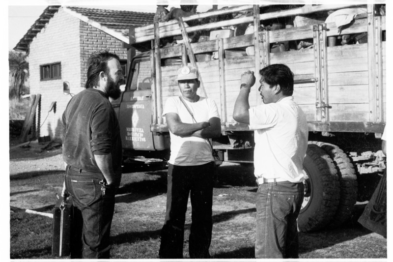 - Jürgen Riester junto a Santiago Comai, líder ayoreo; Hilarión Vaca, administrador del camión "El Kuimbae".